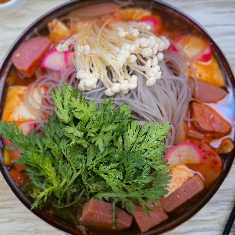 Pork, ham, hot dog, tofu, kimchi, carrots, zucchini, mushrooms, onions, scallions, and vermicelli noodles cooked in a spicy broth.